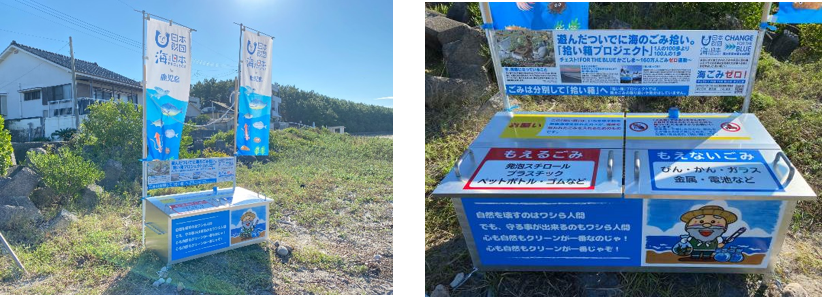 CHANGE FOR THE BLUE鹿児島実行委員会では、与論町で始まった海岸散策等で訪れた方が、少人数でも海岸清掃活動に取り組む事ができる『拾い箱』の活動を参考に、鹿児島県内海岸に「拾い箱」を設置する活動を展開しています。今回、薩摩半島の西海岸(いちき串木野市照島海岸)に「拾い箱」を設置し、「拾い箱」のお披露目を兼ねたプチセレモニーと、「拾い箱」を活用したごみ拾いイベントを実施しました。
