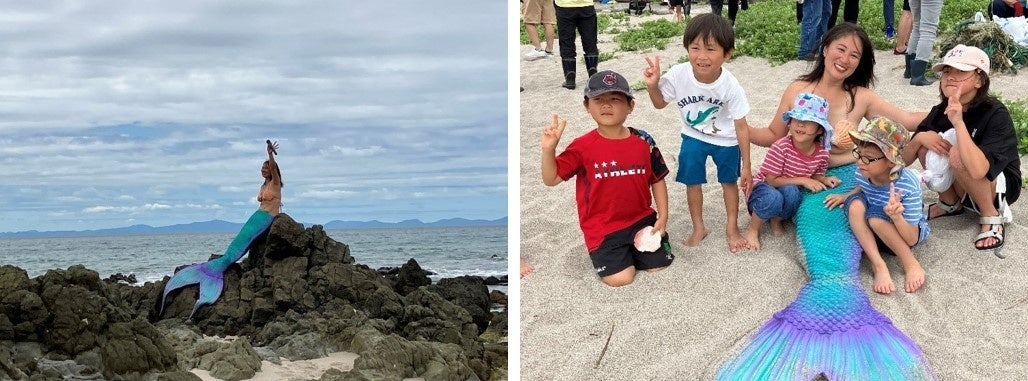 清掃終了後、ダイビングショップ「Ocean Diary」の鮫島百桃子さんが人魚のコスプレでサプライズ登場し、「今日はビーチを綺麗にしてくれてありがとう!」とメッセージを伝えました。波打ち際に現れた人魚に参加者からは拍手が沸き起こり、子どもたちも大喜びで記念撮影をしていました。