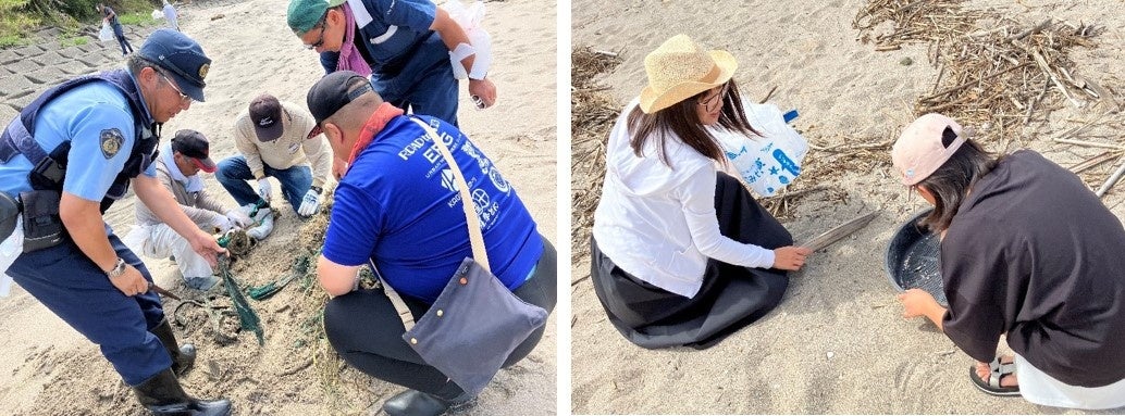 白浜海岸オリジナルの拾い箱「ボイジャーズポート」 運用開始1周年を記念して、地域住民の方と一緒に清掃活動を開催しました。清掃活動には、黎明羽島地区まちづくり協議会の枇榔会長をはじめ、地域住民の方およそ約40名が参加しました。30分間ごみ拾いを行い、大きいごみからマイクロプラスチックなどの小さいごみまで、30Lの袋およそ20袋分のごみが回収されました。大好きな海を子どもたちの世代に引き継ぎたいと、親子で参加する方が多く、子どもたちも、楽しみながらごみ拾いを行っている様子でした。