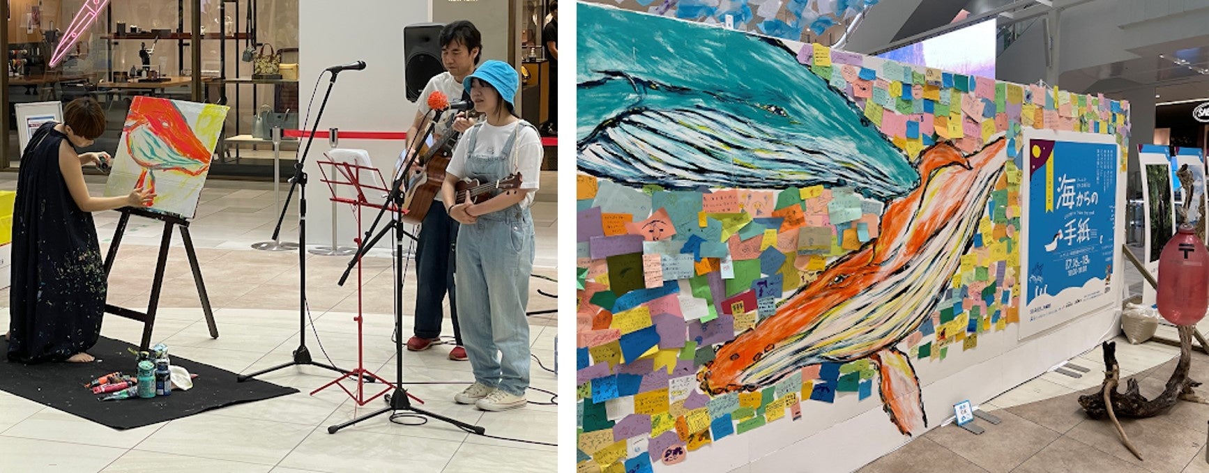 また、会場入り口に設置されたフォトブースでは、Yukakoさんのクジラの作品が展示され、来場者が会場内で感じた海からの‟声”を手紙として集めました。手紙は漂着物のブイと流木で制作したポストへ投函するとフォトブースに展示され、イベントを通して作品が完成する来場者参加型アートの展示も行われました。
