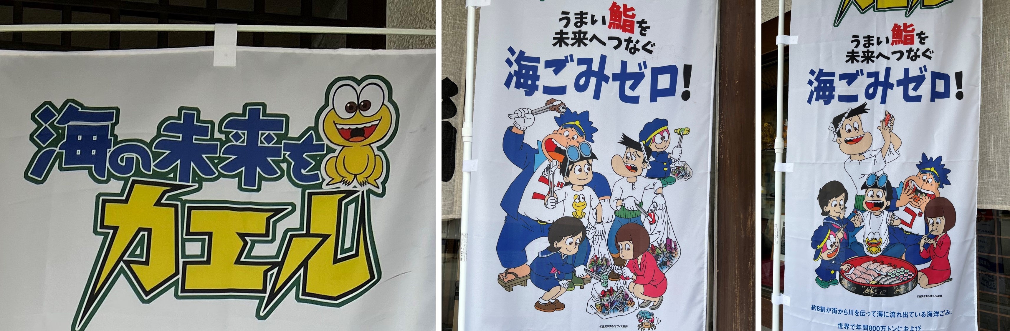 「ど根性ガエル」のキャラクターたちが海洋ごみ対策をよびかけるオリジナルののぼり旗の掲出が、山梨県鮨商生活衛生同業組合のすし店で7月23日(土)より開始しました。新たに描き下ろされたロゴ「海の未来をカエル」や、主人公のひろしや寿司屋の梅さんらキャラクターたちがごみ拾いをするイラストが見どころです。ぜひこののぼり旗を目印に訪れてみてください。