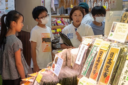 続いて、函館朝市ミニ水族館の水槽のすぐ隣にある老舗「梶原昆布店」を訪問。函館産の真昆布を筆頭に4種類のだし用昆布が店頭に並んでいること、昆布がさまざまな加工品に形を変えて販売されていることを確認し、昆布が幅広い用途で活用されていることを実感しました。