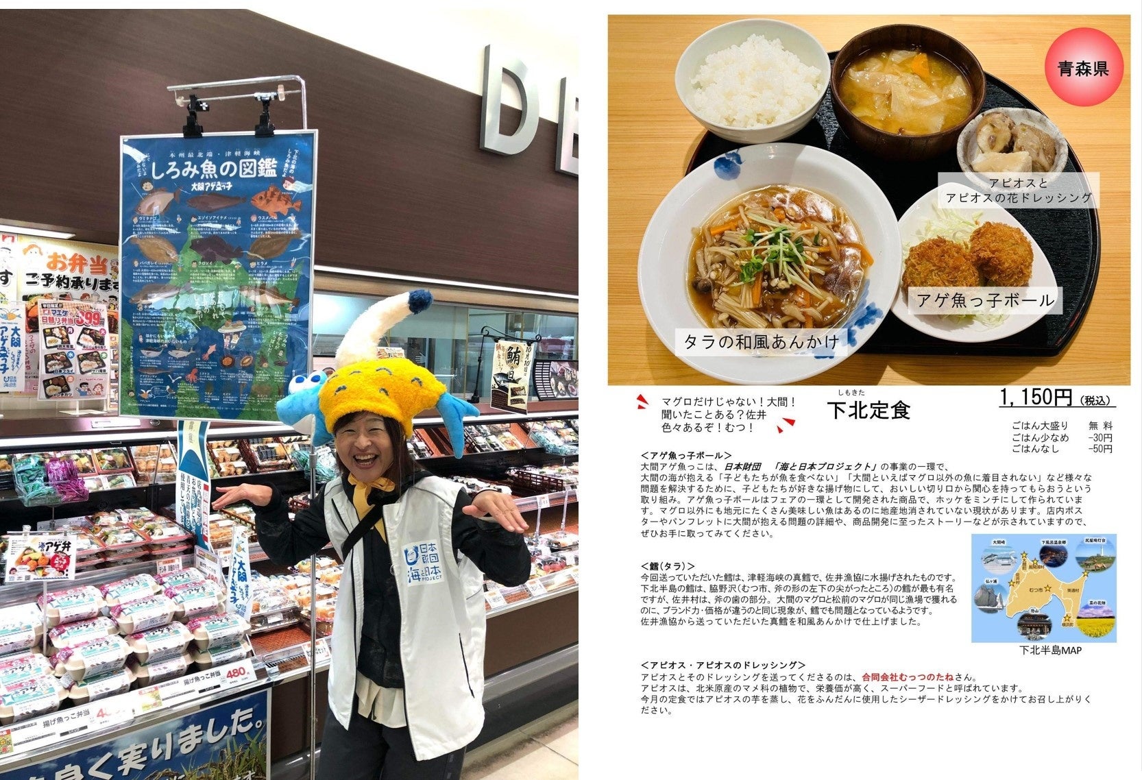 津軽海峡産の未利用魚・ロウソクホッケを皮や小骨ごとミンチにしたものや、網の中で身細りしたマダラを指す「Bタラ」のフィレを使って、子どもが大好きなお店オリジナルの揚げ物メニューにして、2か月間にわたり下北半島・青森・東京の飲食店など35店舗で提供。キャンペーンに先立ち、青森県内に全38店舗を展開するスーパー「マエダストア」では、「海のアゲ弁(アゲ魚っ子弁当)」を販売しました。