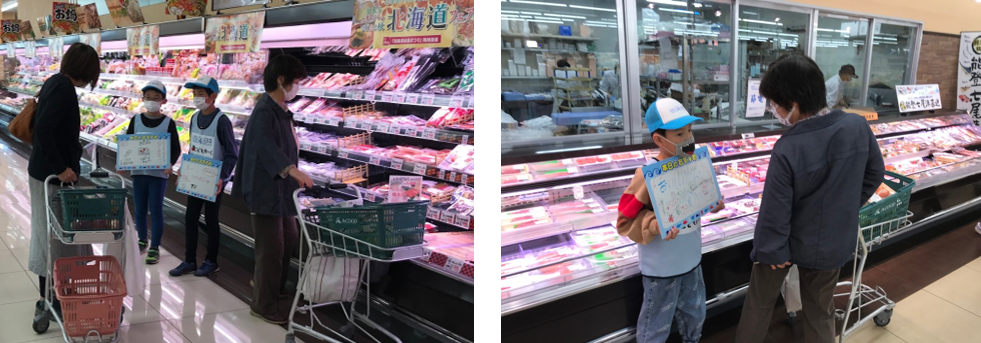 学びの後は、いよいよ実践。バックヤードで学んだお魚の魅力を自分の言葉にしてお客さんにお魚を販売します。子供たちがそれぞれお客さんに伝えたいことをボードに表現して売り場に向かいます。