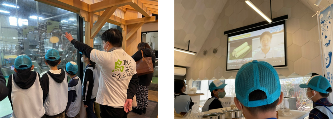 また、千村社長からは、とうふちくわを作る上でのこだわりも。その一つが、毎朝自社で木綿豆腐を作り、その豆腐をとうふちくわに使用していることです。さらに、ふわふわな食感を出すために、豆腐と魚のすり身の割合を7対3にして混ぜ合わせていることが紹介されました。あわせて「とうふちくわ」の歴史についても子どもたちは学びました。その誕生は江戸時代。当時、鳥取では漁港の開発が遅れていたため、魚は贅沢な食べ物でした。鳥取藩主・池田光仲公は、藩の財政も厳しいことから城下の庶民に対し、「魚の代わりに豆腐を食べるように」と質素な食生活を推奨し、魚の代わりに豆腐を混ぜた「とうふちくわ」が誕生しました。元々は質素倹約のため生まれましたが、真っ白な見た目で縁起が良いこと、豆腐を作るには非常に手間がかかったことから、地域のお祭りや結婚式などの「ハレの日」にも食べられてきた食品であると紹介され、江戸時代から伝わる大切な食文化であることが説明されました。