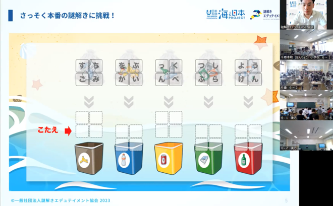 授業の事前学習として「海なぞ水族館」に登場する謎解きを活用。海遊館による講話の前に、海洋プラスチック問題やごみの分別などについての事前知識を遊びながら楽しくインプットしました。
