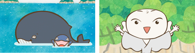 四国と本州をつなぐ瀬戸内しまなみ海道沿いにある鯛崎島で、潮が引いた磯に取り残されたクジラを、お地蔵さまと魚たちが協力して助けると、それから毎年クジラが群れでお礼まいりに訪れるようになった。