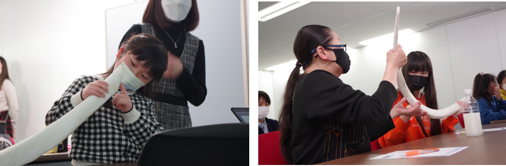 アニメに出てくるクジラは、クジラ類の中では最も泳ぐのが速いイワシクジラ。泳ぎに自信があっても海に取り残されてしまうほど、地元の海の干満差が大きいことを学びました。授業では、クジラの基本的な生態について学び、本物のクジラの骨に触れて観察します。またアニメの中で描かれている、引き潮に取り残されたクジラが魚たちに助けられたという一場面について、人間でも協力すれば持ち上げることはできるのか、という疑問のもと、計算式に当てはめ実際に人間がクジラをも持ち上げる方法について考えました。また、年々漁獲量が減少している瀬戸内海の現状を知り、海の環境変化を学ぶことで、生き物を通して海のことを知るきっかけを作ることができました。