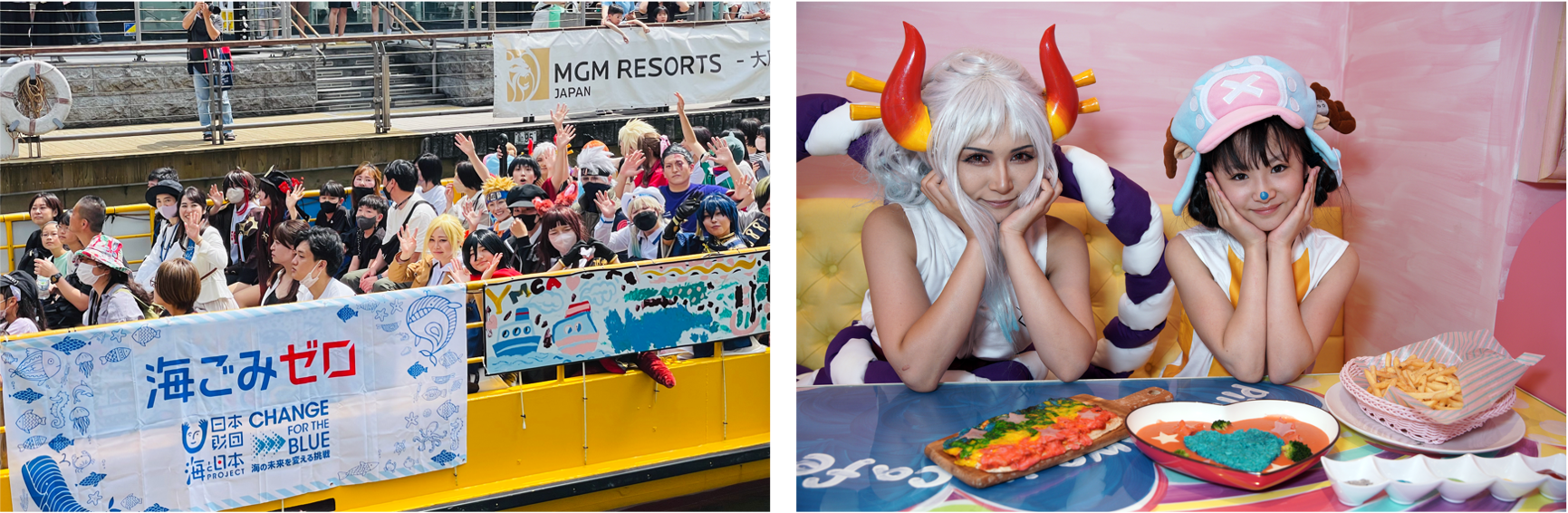 なんばの街中でごみ拾いを行ったコスプレイヤー達は、なんばリバーウォークを中心に撮影会を行ったり、「とんぼりリバークルーズ」に乗船したりして、なんばでの街歩きを満喫。また、今回のイベントに際し「コスプレde海ごみゼロまち歩き協力店舗」としてコスプレのまま入店・撮影の許可をくださったお店にて撮影会を楽しむ様子も見られました。