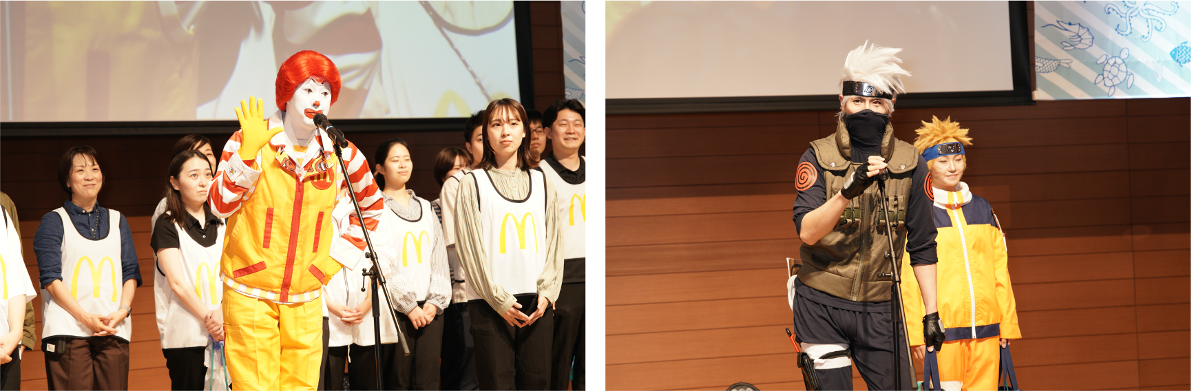 開会式ではイベント協力として参加された海上保安庁・日本マクドナルド株式会社と、コスプレイヤーの3チームが「UMIGOMI-ZERO宣言(海ごみゼロ宣言)」と称して海ごみを減らす意気込みを表明。また、同時刻に「海ごみゼロウィーク」をキックオフする全国8会場(北海道、岩手、富山、愛知、島根、岡山、長崎、沖縄)とも中継を繋げて海ごみゼロウィークに懸ける想いを発表してもらい、全国一丸となって「春の海ごみゼロウィーク2023」の開始を盛り上げました。