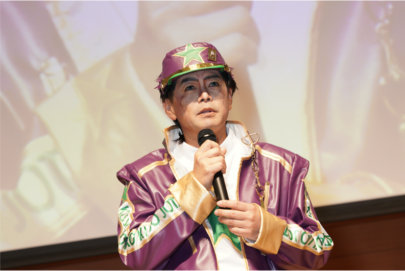 「海ごみゼロウィーク」主催者として日本財団常務理事 海野光行氏、環境省環境大臣政務官 柳本顕氏、後援として、大阪市副市長 朝川晋氏、大阪府環境農林水産部環境政策監 土屋俊平氏が登壇して、海洋ごみを減らすために、まずは陸地のごみを清掃しないといけないという重要性を会場に集まった参加者に呼びかけました。また、日本財団常務理事 海野光行氏はジョジョの奇妙な冒険の空条承太郎のコスプレをし、ステージ登壇者とともにジョジョ立ちを披露し、「ごみを拾って、海を守ろう!」の掛け声で清掃活動がスタートしました。