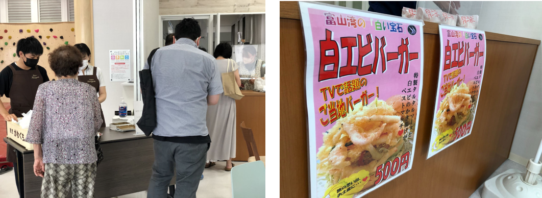 地元射水市で人気の飲食店のコロッケや喫茶店のオムライス、割烹のかき揚げ丼など普段店舗でしか食べることが出来ないシロエビを使ったメニューが、クロスベイ新湊に一堂に会しました。販売していたお弁当はテイクアウトすることが可能で、この日はどのお店にもお客さまの列が途絶えず販売予定約120個の商品はお昼過ぎまでに完売し、盛況していました。