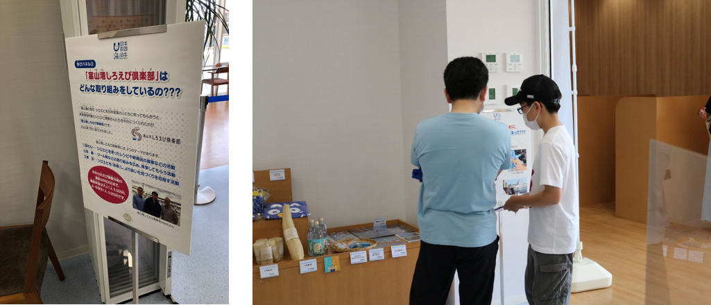 また、富山湾の宝石「しろえび」やサスティナブルな「しろえび漁」、地元射水市のしろえび漁師たちが中心となり設立した「富山湾しろえび倶楽部」のパネル展示を見ながら回答していく「シロエビ★クイズ」を開催しました。参加した子どもたちは、シロエビの生態・売上を分け合うプール制の話題に興味津々の様子で、シロエビ漁や射水市の漁師さんたちの取り組みを知る良いきっかけになりました。中には、シロエビ漁船の出題について、パネルを見ながら考え込む参加者の様子が印象的で、普段身近にある富山湾やシロエビをより深く知るクイズラリーになったようです。