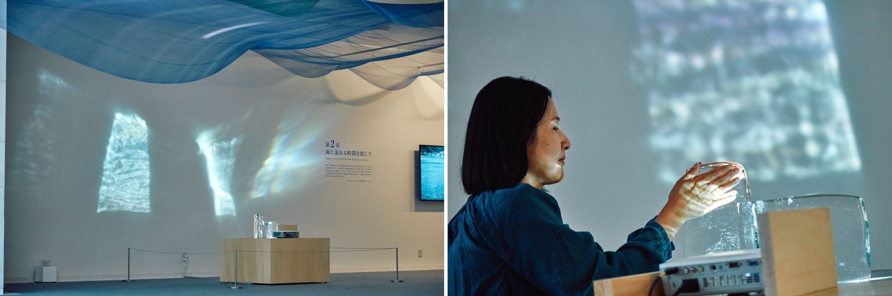 アーティストの後藤朋美さんによる、氷を通して映像を壁に投影させる「氷のインスタレーション」。映像から流れる波の音が会場全体に静かに行き渡り、大きな海のリズムを感じさせてくれます。時間を経て溶けていく氷の変化によって、映像も変化して映し出される様子は、「意識や身体の様に変容しながら、形態は変わり続けながら存在そのものは変わらずに在るもの」という後藤さんの言葉のように、変わらずに存在する海に対して、私たち自身がどう変化することができるのかを考える機会になったと同時に日常で海を思う時間に繋げることができました。