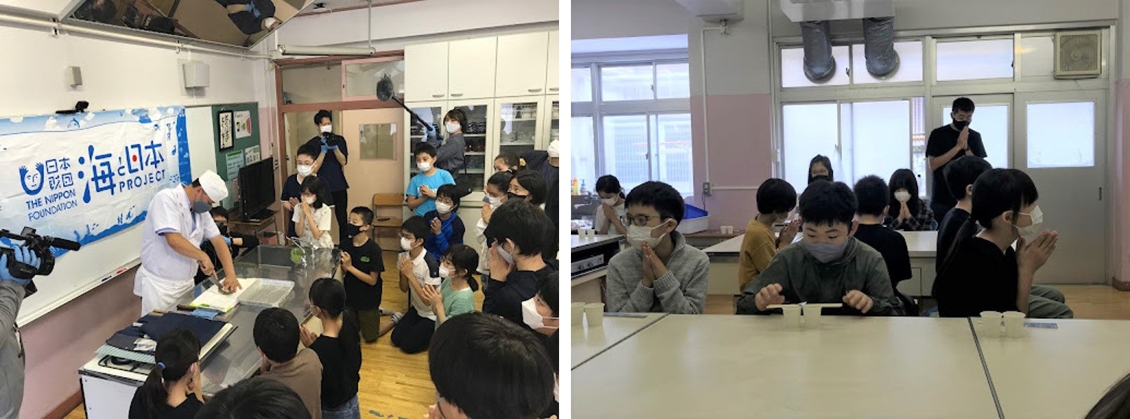 そうしてそれぞれが「食べる」ということに対して思いを巡らせた後、迎えた実食の時間。寿司職人でもある斉藤氏によって、ヒラメの命が取られます。手を合わせながらその様子を見つめる児童たち。さばかれたヒラメはしゃぶしゃぶとして、実食を希望する児童に振る舞われます。「いただきます」という言葉にいつも以上の重みを感じながら食べた後は、「いつもより感謝をしながら食べることができた」という声も聞こえ、児童たちの陸上養殖は幕を下ろしました。この後は、7月に予定されている、陸養プロジェクト参加校をオンラインで繋ぐ「交流会」に向けて今まで学んできたことの総まとめに入る予定です。