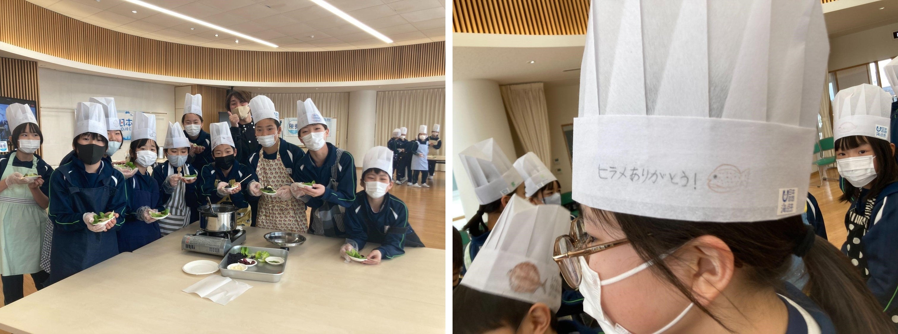 2月1日(水)は児童たちにとって最後の授業でした。みんなでコック帽に思い思いの気持ちを書き、授業に参加しました。この「いのちを頂く授業」では、以前特別授業で講師を勤めた漁師の浜多虎志さんと、料理人の濱多雄太さんが約半年間にわたり一緒に陸上養殖をしたヒラメを調理しました。漁師の浜多さんとともにヒラメを捌き、濱多さんが作ったヒラメの出汁入りスープを使います。各グループに分かれ、野菜を添えたリゾットを一生懸命仕上げました。そして最後は、命に感謝し「いただきます。」児童たちは、自分たちで一から調理したリゾットを食べ、「美味しくできた!」と沢山おかわりをして、完食しました。講師の二人からは「これからも、命を頂くとき感謝を忘れずに美味しくいただいてください」と改めて命を頂くことへの感謝の気持ちを伝えました。