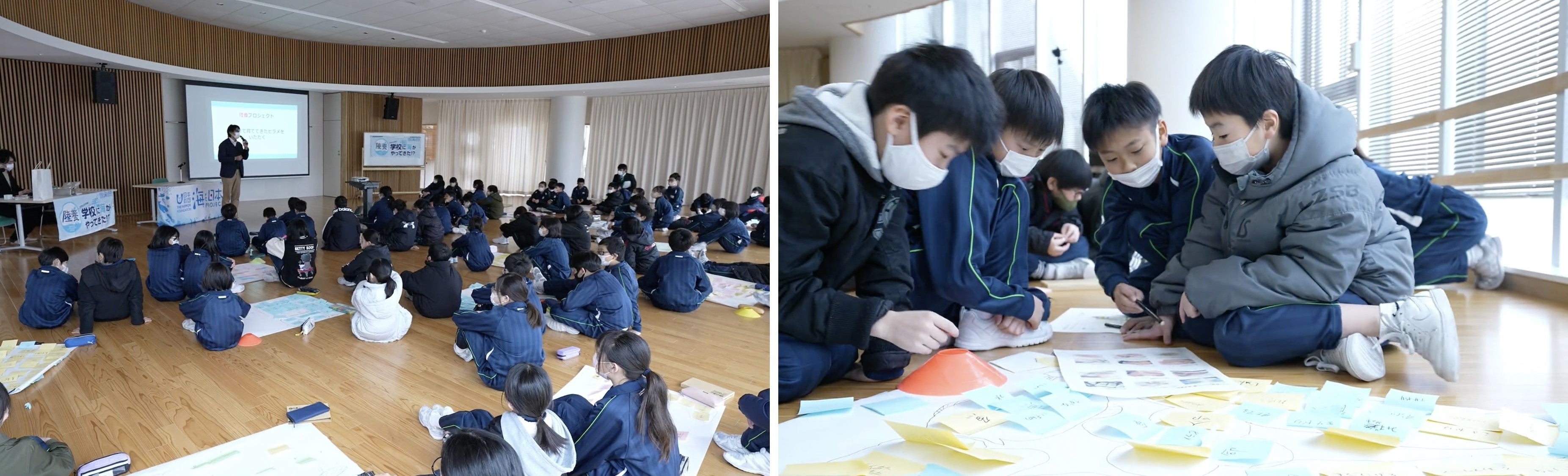 よつば小学校の5年生は、昨年9月より約半年間ヒラメの成長過程を記録し陸上養殖体験を実施。また並行して、地元水族館や漁業協同組合、漁師、料理人から、どういった想いで仕事に向き合っているかお話を聞くことで知り、身近な海とそこに暮らす生き物や、海とつながる環境・生態系全体についても学びました。そして今年1月27日(金)に開催した「議論」の授業では、大切に育てたヒラメをどうするかを参加者のみんなで考えて、以前の授業で命に向きあう漁師さんから教えてもらった「感謝の気持ちで捌いている」という言葉を大切にし、育てたヒラメを感謝の気持ち込めて食べる決断も。様々な授業やワークショップを通して、自分の考えを整理している様子が伺えました。