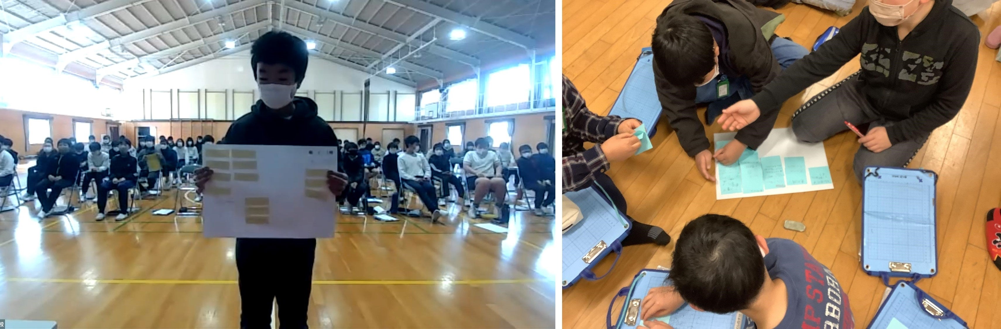 まず、参加各校から、陸養プロジェクトで育てていたヒラメのことや、特別授業で知った海や水産業に関することなど、それぞれ学んだことを発表しました。学校で実際にヒラメの陸上養殖を頑張ってきた児童たちは「えさやりを忘れないよう工夫した」「世話の仕方をおぼえるのが大変だった」「いのちの大切さを知った」など、養殖体験から得られた感想を聞かせてくれました。また、海や水産業に関係する地域の方に特別授業をしていただいた経験から「自分たちの身の回りには生き物、環境など大切なものがたくさんあることがわかった」と、学んだことを他の学校の友達に教えてくれた児童も。発表後にはお互いに質問をし合って学びを深める様子が印象的でした。
