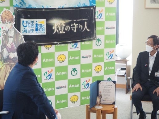 燈の守り人キャラクターを活用して、地域の灯台を歴史・文化資産として活用する機運をつくるため、キャラクター化の対象となる「蒲生田岬灯台」が立地している徳島県阿南市の桑村申一郎阿南市政策監を、「燈の守り人」製作委員会プロデューサーの柴田英知が2022年7月20日(水)に表敬訪問し、キャラクターの贈呈式を実施しました。