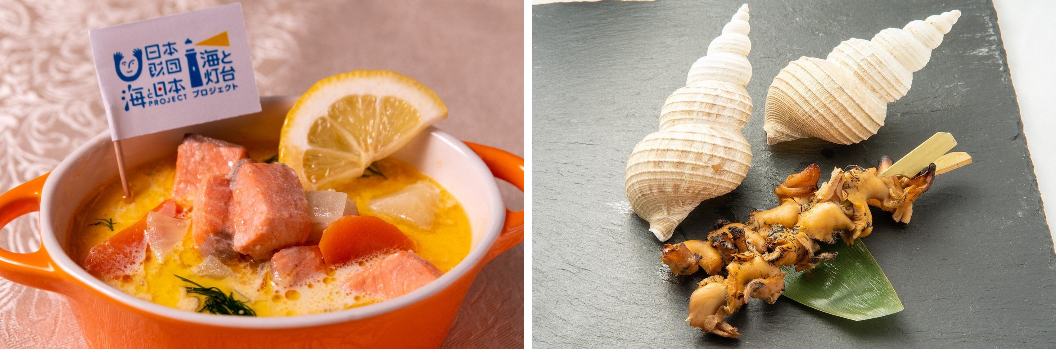 サウナで大量の汗をかき、心身ともにととのった後で食べるご飯「サ飯」(サウナ飯の略称)。今回は、恵山岬灯台スペシャル「サ飯」として、本場・フィンランドでサウナ後に食べる「サーモンクリームスープ」と、貝の形が灯台に似ていることからその名がついた「灯台ツブ」の串焼きの2品を用意しました。北海道産の鮭と牛乳がたっぷり入ったサーモンスープはまろやかな味わい。灯台ツブは食感と風味が良く、いずれも参加者から大好評でした。