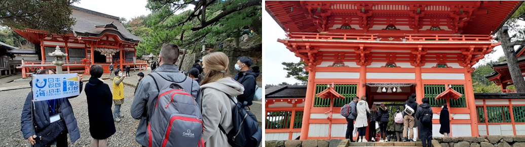 「”日の沈む宮”日御碕神社は夜を守る神様」。天照大御神を祭る伊勢神宮と対をなす日御碕神社(島根県出雲市大社町日御碕)。日御碕灯台の敷地かつて日御碕神社が所有しており、明治時代の建設時には国に働きかけたといいます。参加者は地元ガイドから日御碕灯台の繋がりや”ご縁”を聞きながら神社を参拝しました。