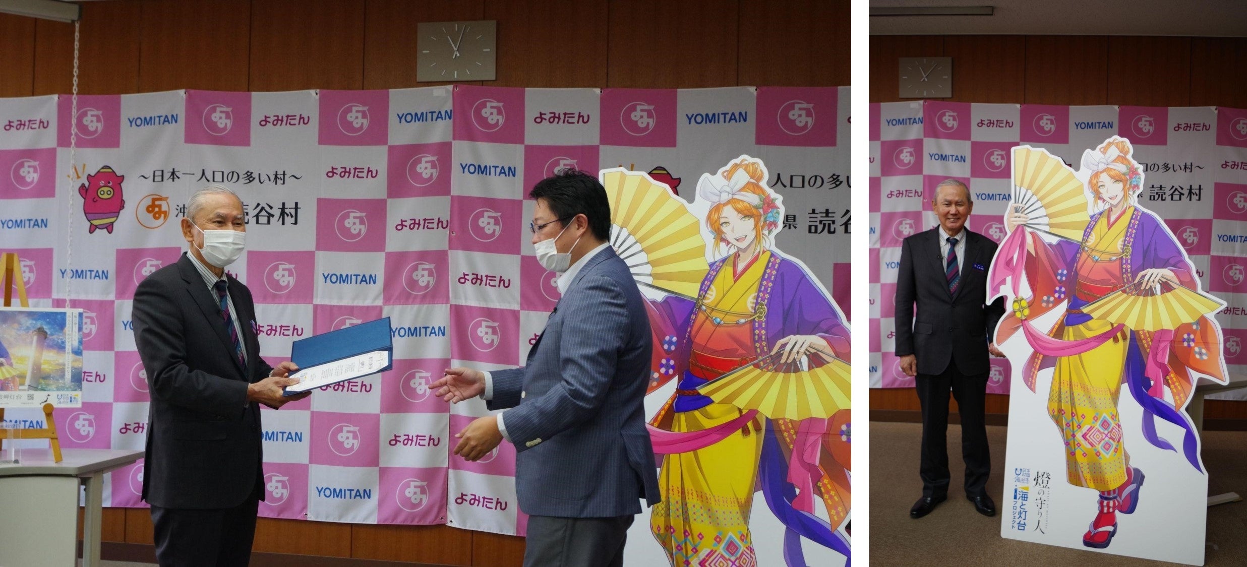 沖縄県読谷村「残波岬灯台」を擬人化したキャラクターが完成! 「燈の守り人」製作委員会プロデューサーが 石嶺傳實村長を表敬訪問しキャラクター贈呈式を実施しました