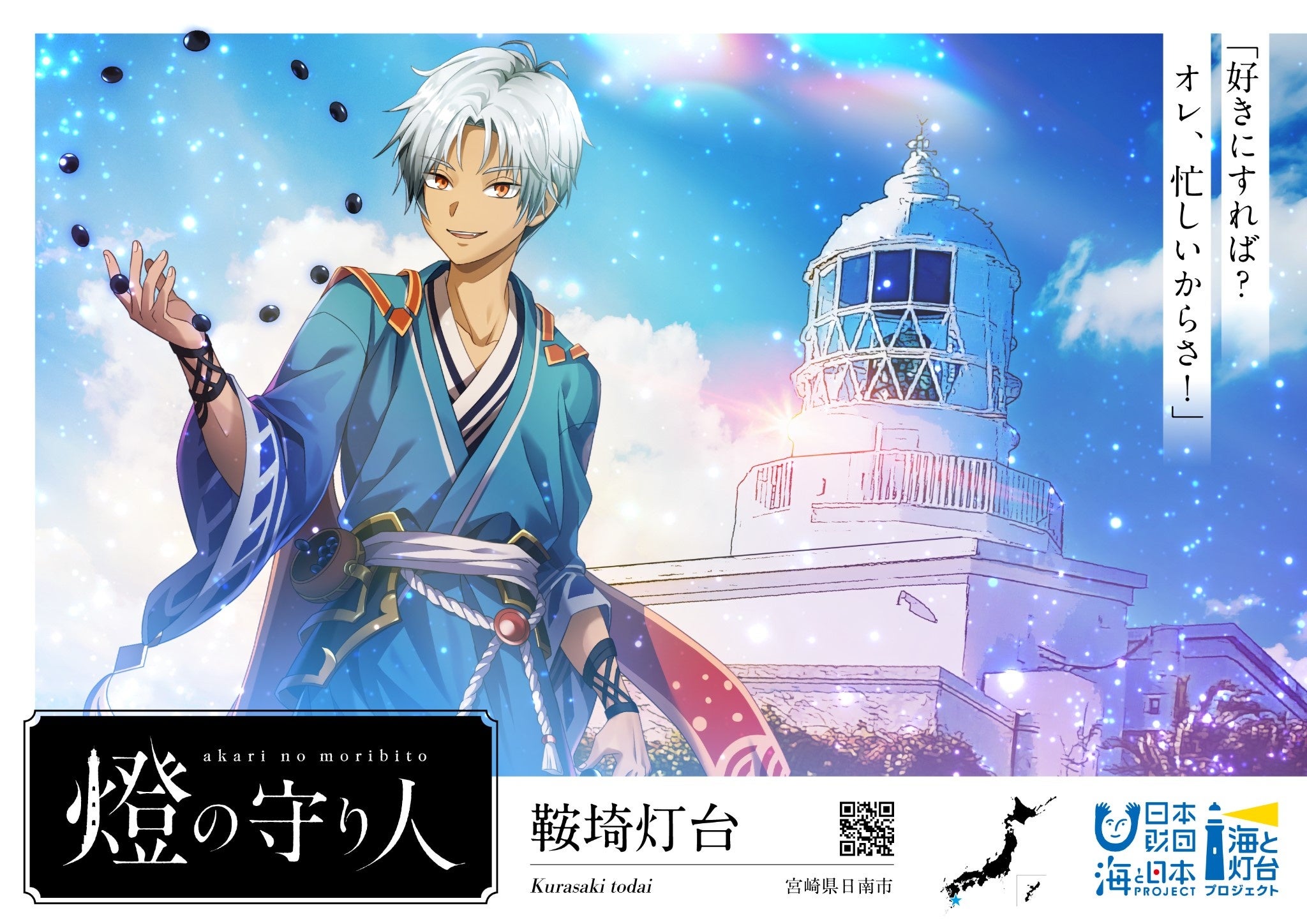 鞍崎灯台は、鉄筋ではなく無筋のコンクリートで作られている特徴から、骨太なイメージではないかなと華奢な少年のようなキャラクターにしました。黒い石のようなものは武器で、鵜戸神宮の幸福を祈って投げ入れると願いが叶うという「運」の文字が刻んである素焼き”運玉”から着想を得ました。無人島ではあるんですがまずは地元の皆さんに愛していただきたいので、すぐそこの無人島にイケメンの少年が住み着いたなと面白がっていただければと思います。
