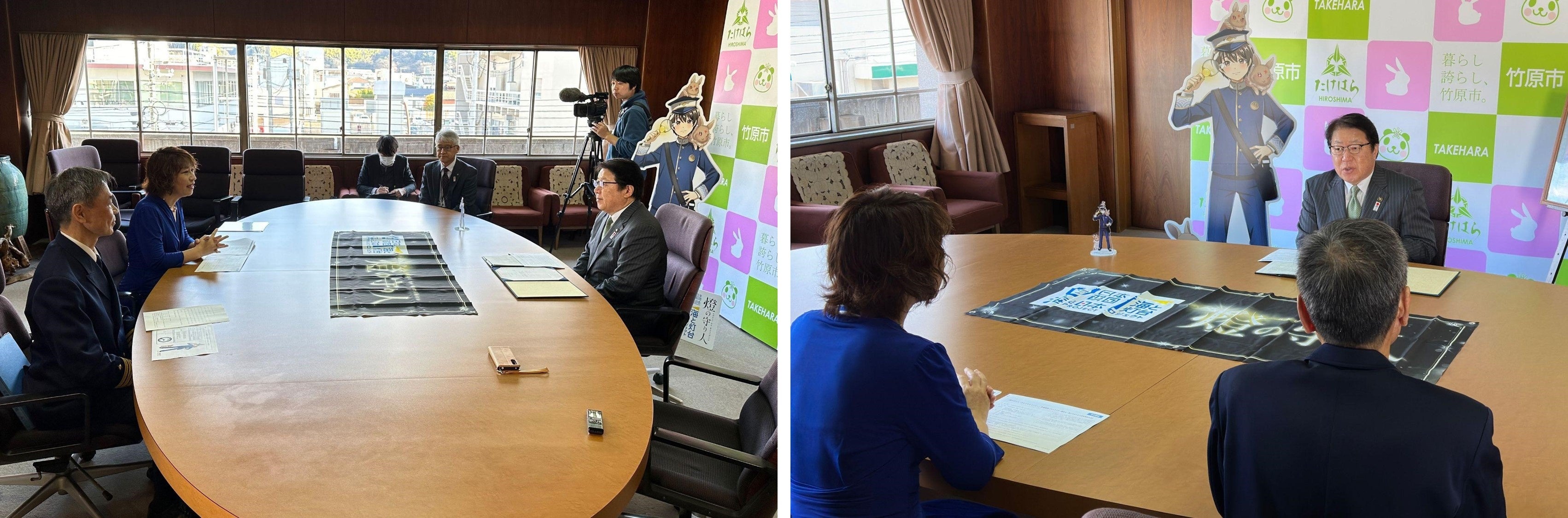 1.「燈の守り人」キャラクター贈呈式 2.フォトセッション(キャラクターの等身大パネルを挟んで記念撮影) 3.会談(竹原市長、燈の守り人製作委員会プロデューサー、呉海上保安部部長) |