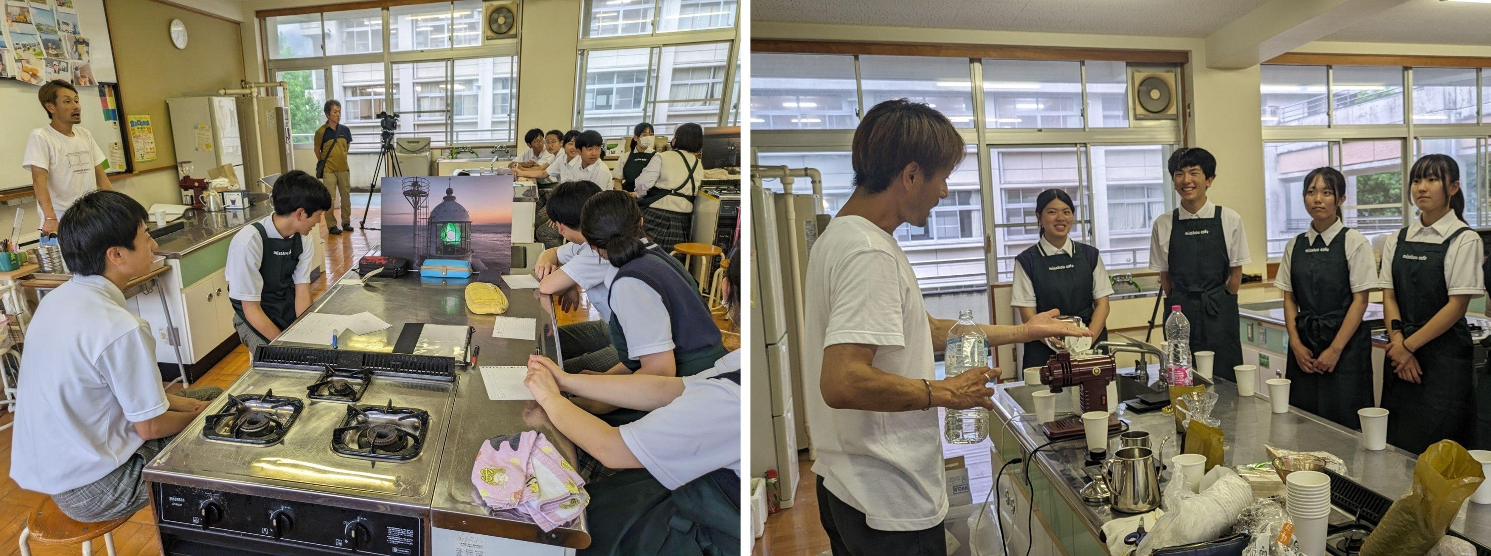 第二部では、まず高校生が考える「佐田岬灯台カフェ」のスタイルやコンセプトを思いつくままに発表していきます。生徒からは、「瀬戸内海と宇和海、2つの海を隔てる特別な場所」、「日没後数分だけ見られるエメラルドタイム」、「20分歩くので休憩場所が必要」、「灯台のバルコニーで提供したら特別なサービスになるのでは」、といった様々なアイデアが湧いてきました。その後は、実際に珈琲を提供するカフェ班と、カフェの屋号やロゴデザインを考える販促班に分かれて活動しました。カフェ班は一杯の珈琲を美味しく提供する際のポイントを戸田さんの実演を交えながら学び、販促班は「佐田岬灯台カフェ」らしさを屋号やロゴにどのように落とし込むか考えました。時間の制約があり、この日のワークショップは約2時間で終了となりましたが、大変内容の濃い初回の活動となりました。今後は、9~10月頃に高校生によるモニター営業を経て、11月に佐田岬灯台周辺で予定されているマルシェイベントへの出店を目指しています。