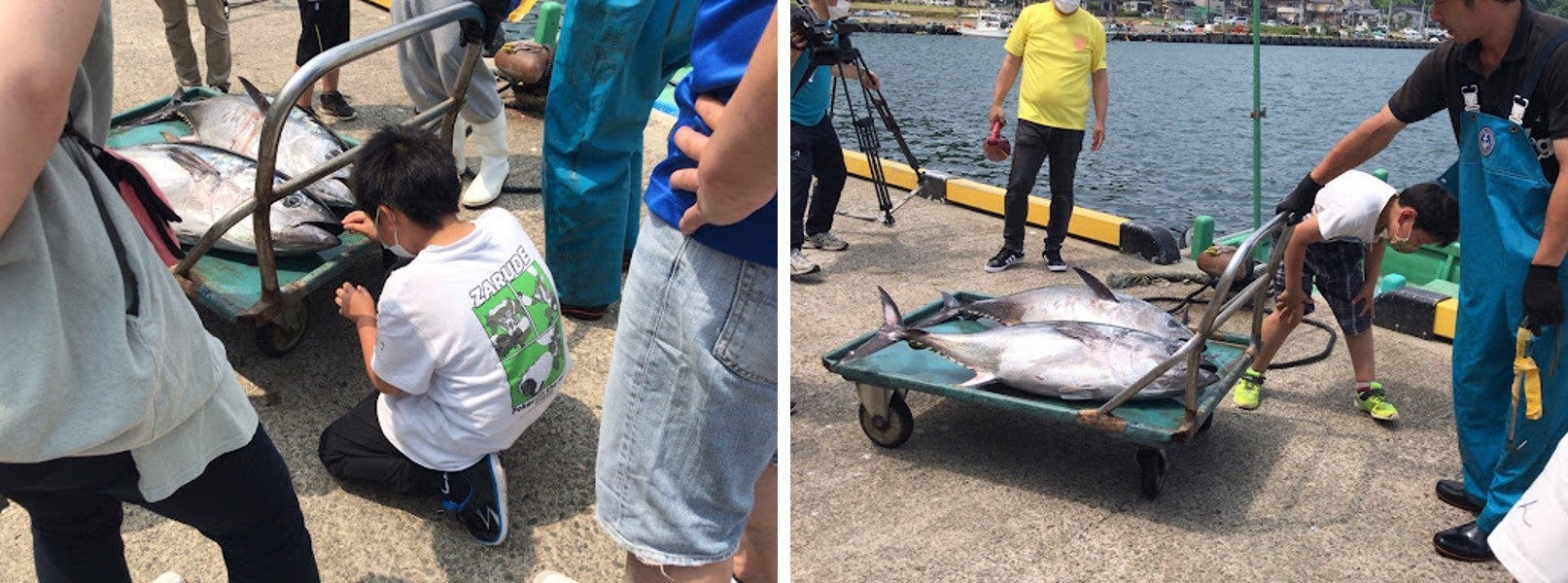 当日はマグロが水揚げされており、普段なかなか見ることのできない水揚げの現場や、漁師の話に参加者たちは皆関心を示していました。