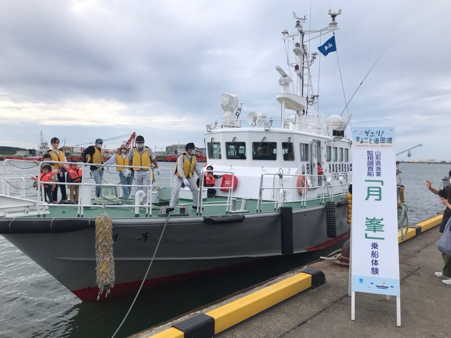 会場では、国土交通省港湾業務艇「みずほ」、山形県漁業試験調査船「最上丸」、山形県漁業監視調査船「月峯」の3隻の一般公開と乗船体験を行い、多くの来場者が集まりました。乗船には親子連れが多く集まり、普段なかなかできない体験に大人も子どもも喜んでいる姿が印象的でした。乗船した子どもからは、「また乗りたい!」という声が上がり、出航終了後にも船内の見学会がじっくりと行われました。