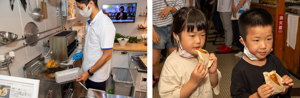 函館ブリたれカツは、地球温暖化などの影響により海水温が上昇し、函館での漁獲量が急増したブリの地域での食文化の定着を目指して2020年に開発した海のごちそうグルメです。牛乳や真昆布エキスに浸す下処理を施すことで、ブリ特有の臭みをなくし、ふっくらとした食感で幅広い世代の方々に親しんでいただける一品になっています。当日の振る舞いでは、北海道内・外から函館に訪れていた観光客の方々にも召し上がっていただき、ブリを通して海について考えていただく機会となりました。