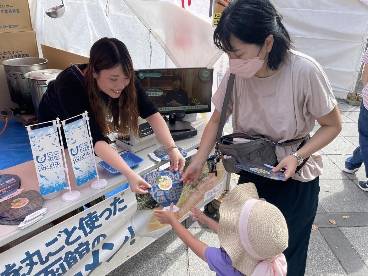 函館ブリ塩ラーメンを食べようとお並びいただいた方の列は最大で50名以上の長蛇の列となりました。お待ちいただいている方には海洋環境の変化についてやブリの特徴などがわかるオリジナルの紙製うちわを配布したり、モニターで動画を流したりと待ち時間を海について触れる時間にもしていただきました。スタッフからうちわを受け取った方々はうちわをあおぎながら「ブリってそんなに獲れているんだ!初めて知ったね」と話していたり、「ちゃんとごみは捨てようね」と話している親子もいたり、モニターに映るブリをじっと見つめていた子どももいました。