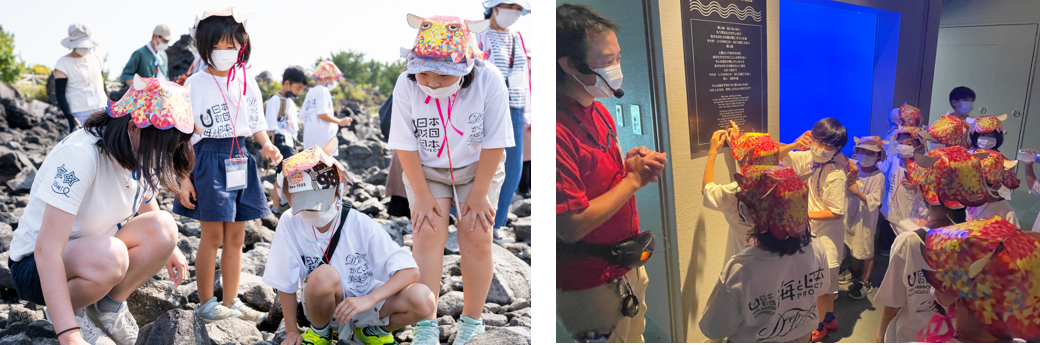 3つ目のプログラムでは、福島大輔氏(桜島ミュージアム理事長)の協力のもと「桜島と錦江湾の成り立ち」を学び、施設近くの海辺で「生き物探索」を行いました。生き物探索では、ナマコやヤドカリなどの海洋生物を発見。今回、絶滅危惧種のハクセンシオマネキは発見出来ませんでしたが参加者は夢中で海辺の生き物を探索していました。またその際に見つけたごみを参加者で回収し、未来の海を守っていく意識を高めました。