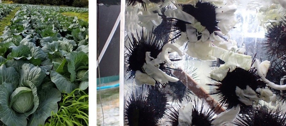 当プロジェクトに参画する鳥取県漁業協同組合では、10月下旬より、鳥取県が行うウニ漁港内養殖技術開発試験として、青谷支所と泊支所の2か所で漁港内の活用されていない区域(陸上、海面)を活用した試験蓄養を実施しています。ウニは食欲旺盛なことから、身入りや味に効果的な餌の安定的な確保が課題となっていたところ、JA鳥取中央倉吉秋冬野菜生産部より軽い虫害などで出荷できないキャベツやブロッコリーを安定的に提供いただけることになりました。