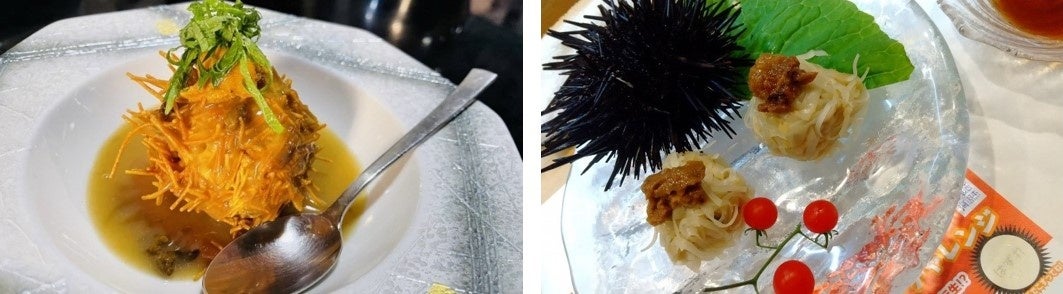 うなぎ料理店ではうの花ウニを海鮮葛餅にして、地元の白みそを使ってお椀に仕立てた「うの花ウニの葛餅 西京仕立て」、フランス料理店ではチーズと生クリームを加えてキッシュ生地で焼き上げた「うの花ウニのクリーミーココット焼」、そのほか、「うの花ウニのしゅうまい」「うの花ウニのコロッケ」など、お店ごとに工夫をこらしたさまざまなオリジナルメニューです。