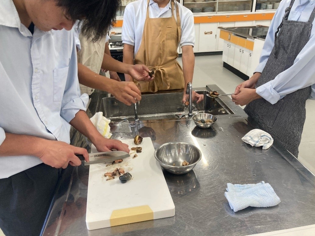 今回は2年生が6月から勉強会にてウニのことを学び、現地学習で実際の漁業の現場を視察し、ウニをはじめとする藻場の生き物や大切さを身をもって体験してきたことを踏まえ、ウニ等の藻場のめぐみを実際に食べて感じてもらうための調理実習を実施しました。