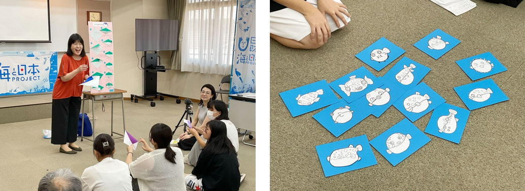 今回の中間報告会を踏まえ、11月4日に最終リハーサルを行い、11月下旬に「学校法人河野学園 認定子ども園 下関短期大学付属 第二幼稚園」、「社会福祉法人 松美会 幼保連携型認定こども園 しおかぜの里こども園」の2園で教育実習を行う予定です。学生たちが考え制作した海とフクの学びコンテンツを、教育実習を通して園児たちにどのように伝え学びに繋げていくか、またこの教育実習を定期的なカリキュラムとして実施していく自走化に向けて掘り下げていきます。