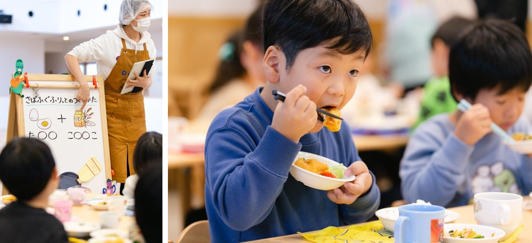 下関はトラフグが有名ですが、トラフグのほかにも美味しいフグがあり、自分たちがそれを給食で食べていることを認識することができました。この給食はイベントに参加していない園の子どもたちの多くが食べ、「おいしい!」と言っておかわりをする姿も見られました。