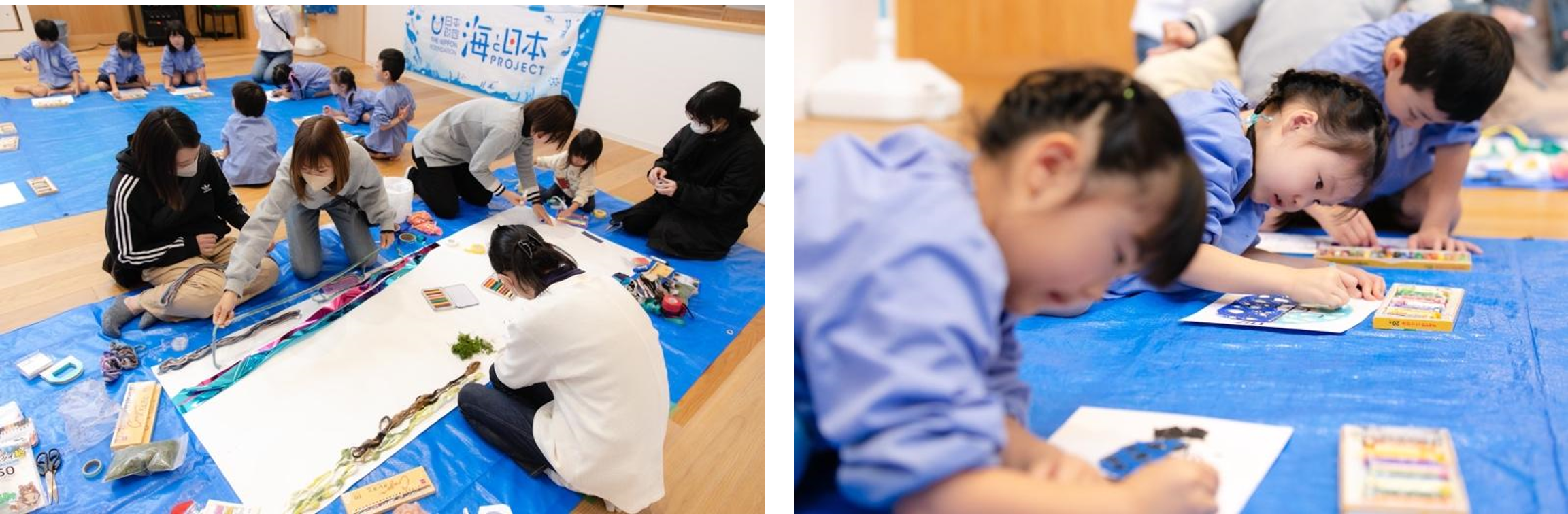 全国で活躍する海・感性・⾷の専⾨家と下関のフグの専⾨家が⼦どもたちに「海の授業」を開講。下関の海とフグを学び、水産大学校の学生3名が制作したフグと海を題材にした知育玩具やゲームで遊び、VRで海の擬似体験をし、絵に表現し、フグを⾷材とした給⾷をいただくことで総合的な学びの機会を提供しました。