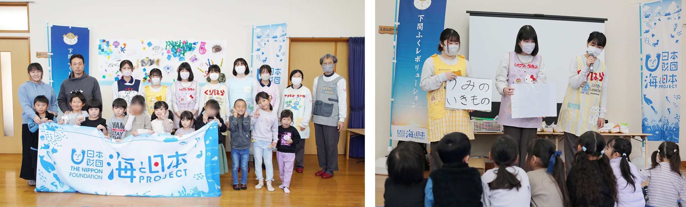 下関短期大学付属第二幼稚園は周囲をぐるっと海に囲まれた下関市彦島に位置し、目の前が美しい海というまさに海の授業に最適の環境。園児のみなさんは、事前に「海の工作」をたくさん作り講堂に展示。保護者向けの発表会も行われ、この日のイベントを迎えてくださいました。
