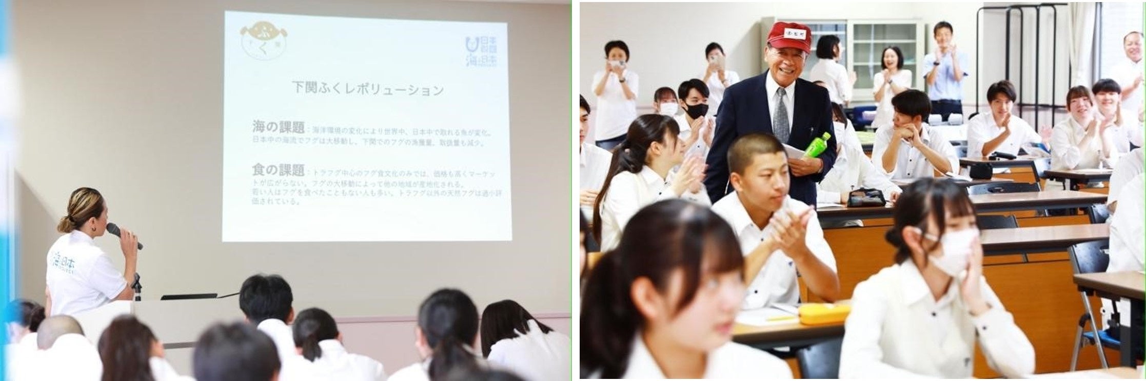 下関商業高等学校の生徒45名が、「下関の観光と海とふく」をテーマに、地域ブランディングで活用できるキャッチコピーの制作を行いました。キャッチコピーの制作にあたり、普段聞く機会のない「海の授業」を実施。「海の授業」は下関市内の幼児教育施設・小中高・大学と連携し、子ども達や若い世代に、下関の海の課題や海からの恩恵を受けている食文化について知ってもらい、体験し、自分ごととして捉え各々がアクションを起こしていけるような取り組みを続けています。