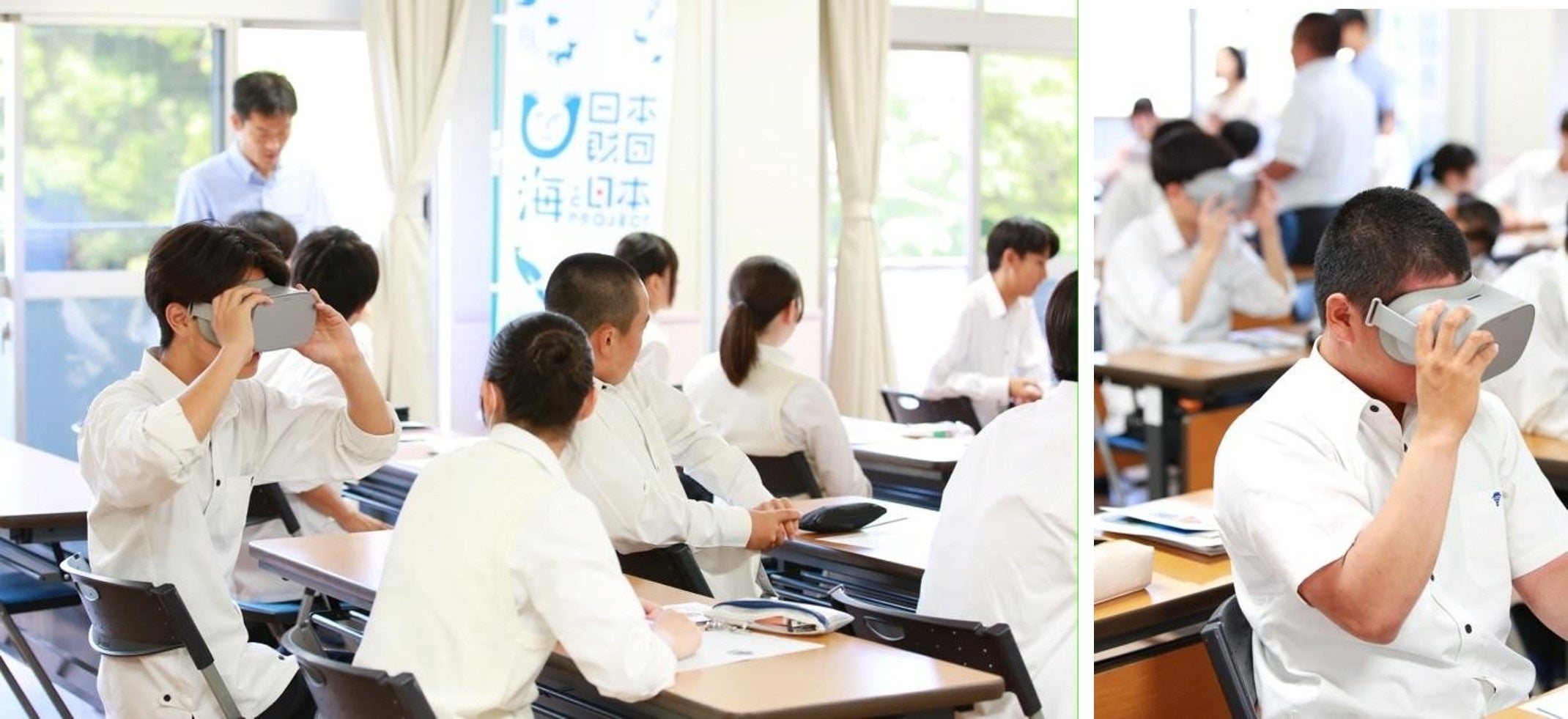 ダイバーとしてギネス記録をもち、水中生物とコミュニケーションを取りながら世界の海で水族表現家として活動する二木あいさんが魚と一緒に泳ぐシーンが、前後左右360°VRの映像でゴーグルを通して目の前に広がります。「え!人魚じゃない?」と二木あいさんの姿に声をあげる様子も。生徒の皆さんにはゆっくりVR体験をしていただこうと、この日、4台のゴーグルの貸し出しを行い、他のクラスの生徒のみなさんにも体験してもらうことができました。