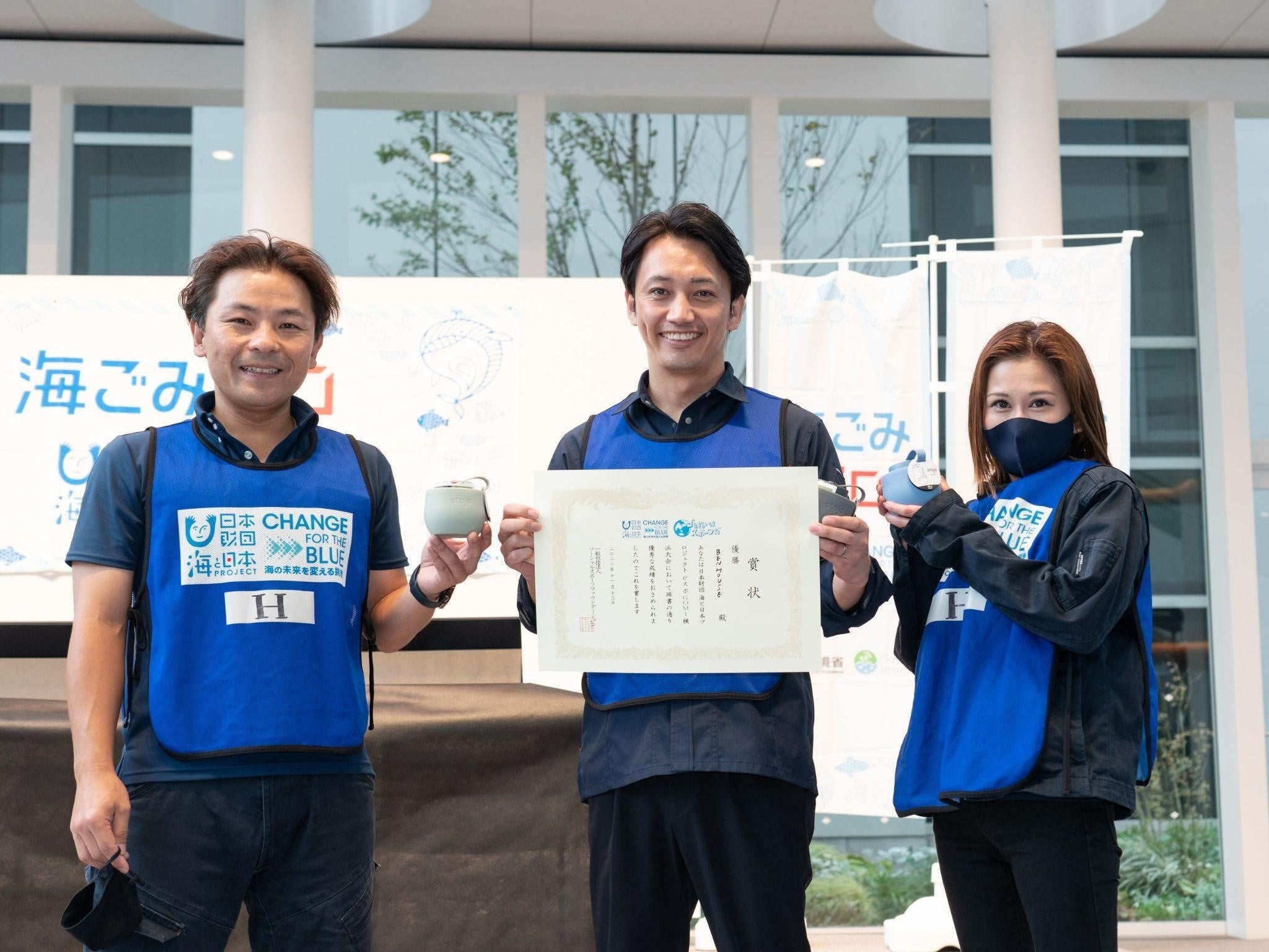 優勝した「BEN HOUSE」チームには、賞品として折りたためるマイボトル「STOJO(ストージョ)」を贈呈。MCからのインタビューに対して「横浜のことはよく知っていますが、思っている以上にごみが落ちていることが分かりました。横浜を少しでもきれいにできたなら良かったです」とコメントしました。