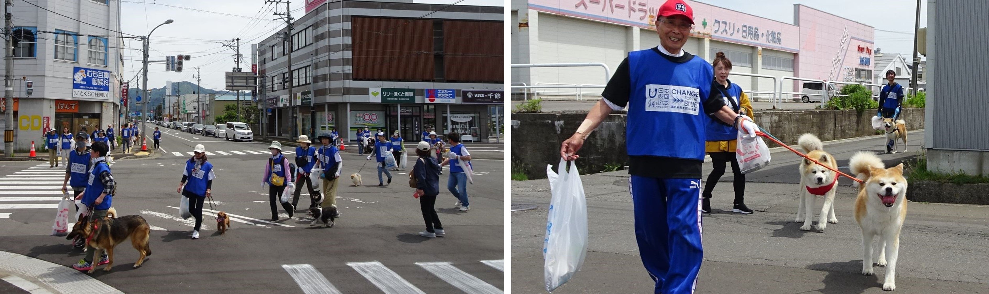 大館市観光交流施設「秋田犬の里」の協力により、愛犬家と秋田犬9頭が参加し、大館市中心街でごみ拾い活動を行いました。日本の国犬であり、国の天然記念物としても指定されている秋田犬は、美しい姿と飼い主に忠実な性格で、世界中で人気のある犬種です。大館市の中心街で、CHANGE FOR THE BLUEビブスを来た参加者30名と、秋田犬をはじめ、様々な犬種21頭と一緒に散歩しながら行う清掃活動はめったに目にすることがない機会であり、道行く方々から大変注目を集めました。愛犬とのごみ拾いを目にし、犬の散歩でごみ拾いという新習慣を知った愛犬家の方々に、犬のフンの処理と併せて目についたごみも拾って街をきれいにしようという新しい習慣が浸透し、この運動が広がって欲しいと願います。