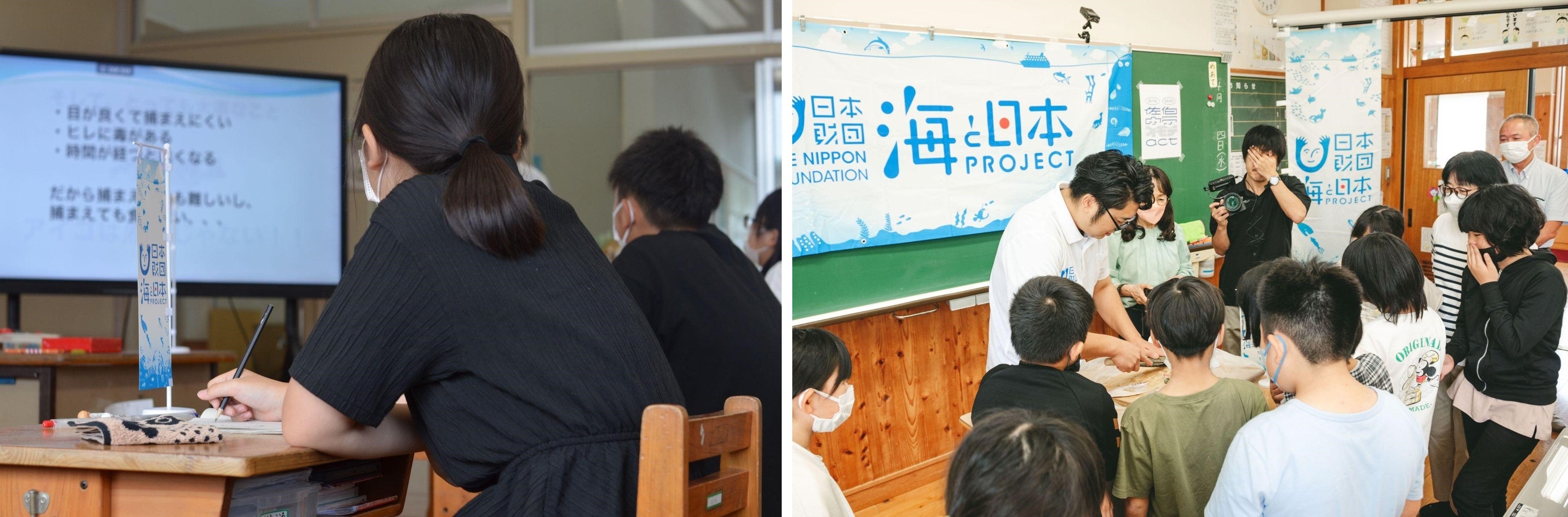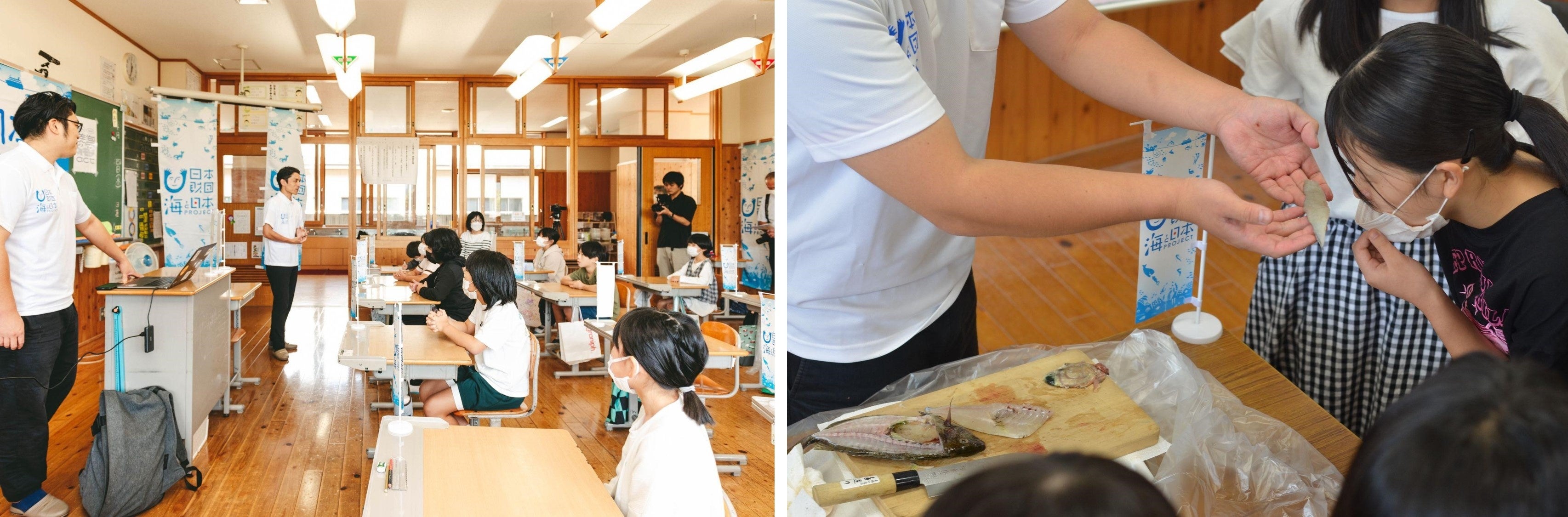 給食提供だけではなく、佐伯市立直川小学校では小学校4・5年生を対象に、佐伯市立東雲小学校では6年生を対象に給食提供と同日に出前授業を行い、校内放送で佐伯ウラオモテアクトや海のごちそうプロジェクトの意義・目的、アイゴを食べる背景についても全校児童・生徒に放送を行いました。