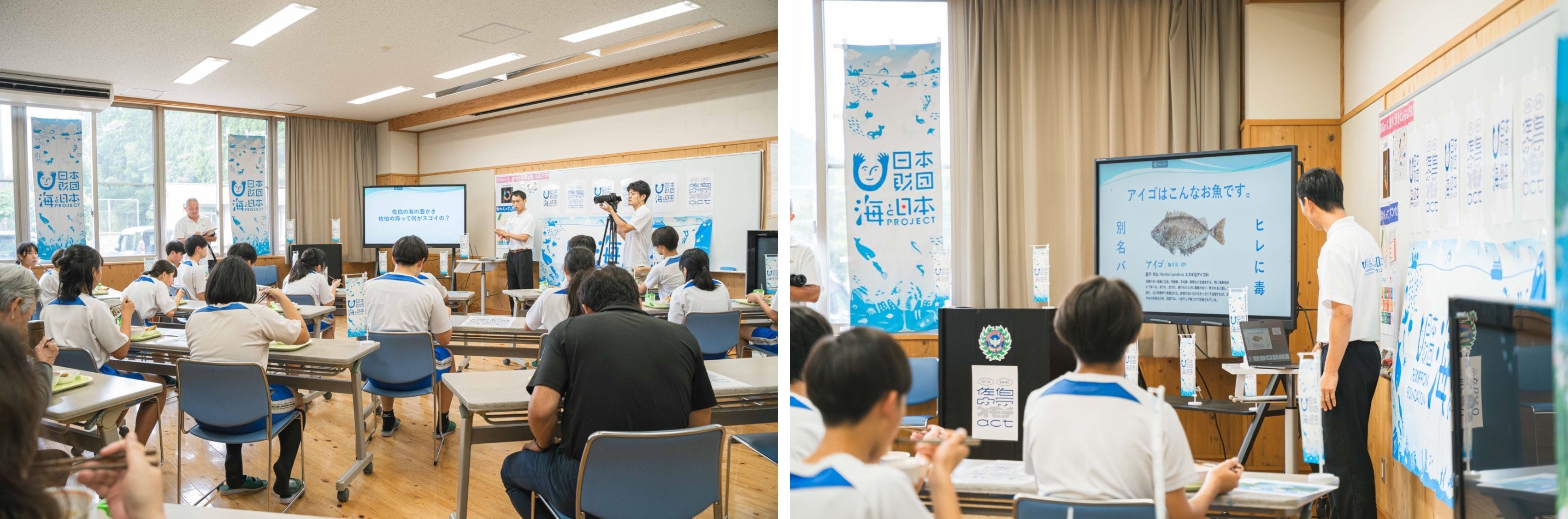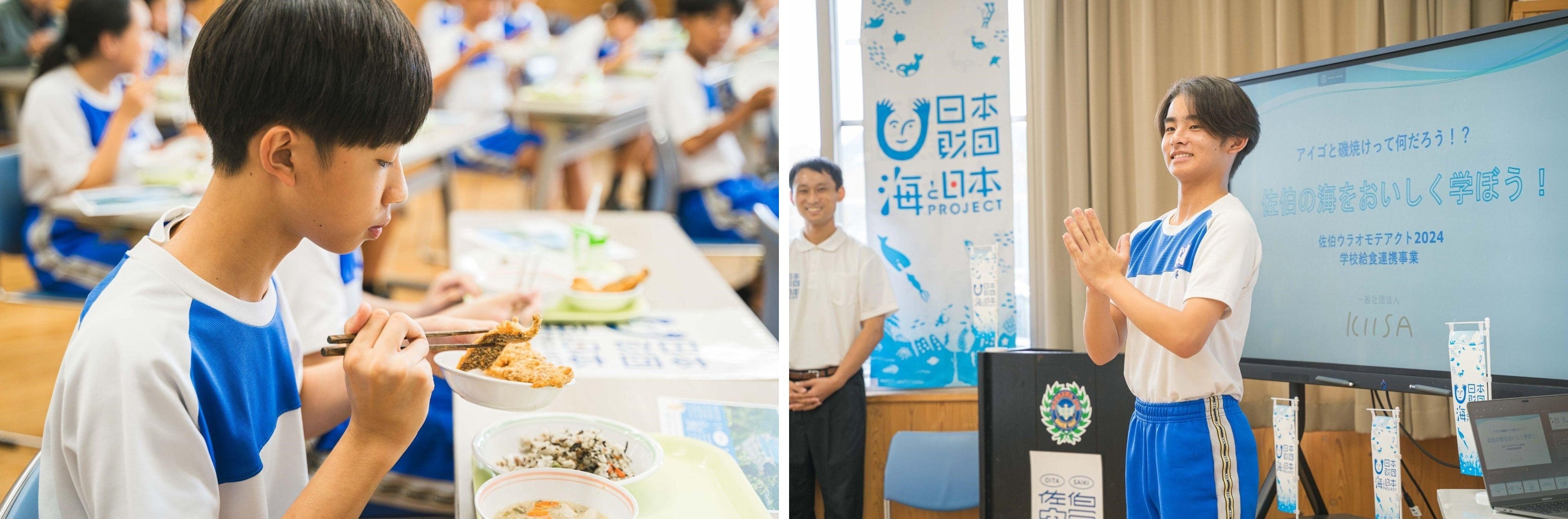 一般社団法人KIISAは、海のごちそう地域モデル事業in佐伯「佐伯ウラオモテアクト」の一環として、市内小学校、中学校にてアイゴのフライ“アイボー”の学校給食提供を実施。給食提供だけではなく、佐伯市立直川中学校の全生徒、佐伯市立東雲小学校の6年生を対象に給食提供にあわせて、佐伯の海を学ぶ出前授業を行い、海の未来に繋げる本プロジェクトの意義・目的、磯焼けや藻場、アイゴを食べる背景について美味しく学んでいただく機会としました。