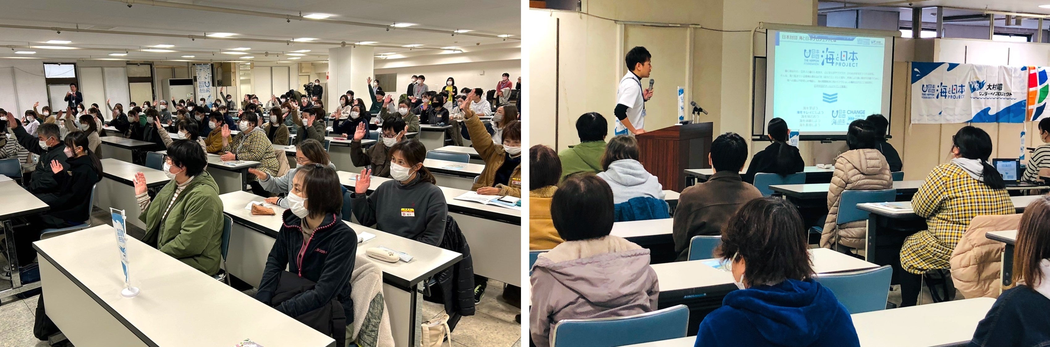 そして、大村湾は「超閉鎖性海域」と呼ばれることを知っているかの問いに対して、手を挙げたのは一人。なんとなく、外海とあまり繋がっていない程度の認識で、外海からごみが入ってくる可能性は低いことなども、考えもしなかったようです。講義を受けて、「外海からの影響を受けにくい大村湾のごみ問題は、周辺地域の生活環境が強く影響するため、企業・自治体・地域住民がワンチームとなって課題解決に取り組むことが重要」という発信に参加者は頷いていました。