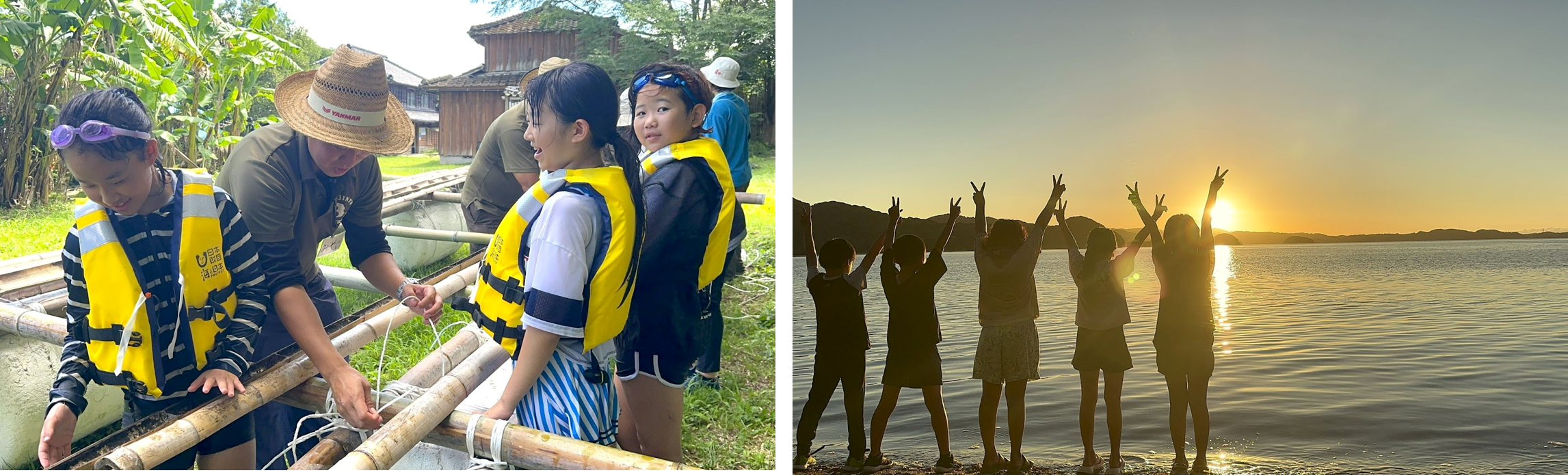 テントの次は、2日目のイカダ脱出プログラムに向けて、イカダづくりに挑戦です。参加者たちは、初めての学び・体験に興味深々でした。イカダが海の上で崩れないようにロープでしっかり結ぶことが重要と教えられますが、慣れない結び方に悪戦苦闘! 先生に必死に作り方を聞きながら、なんとか作り上げました。