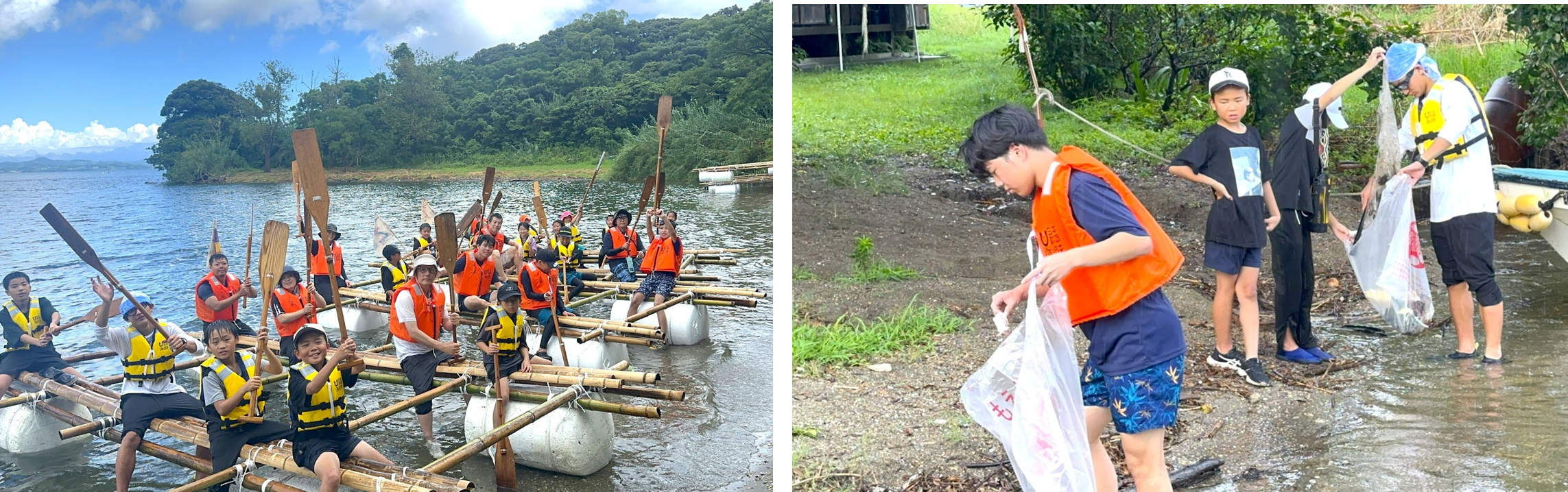 ごみ拾いが終わったら、いよいよ1日目に作ったイカダで島を脱出します! 少々不安そうな面持ちの参加者もいましたが、スタッフから「大村湾は閉鎖性海域だから波が穏やか。安全に海を楽しむのに最適なんです」と説明があり、みんな安心した表情に変わりました。※7月20日(土)~21日(日)開催は、2日目に悪天候のためイカダで島を脱出することはせず、船で本島にもどりました。